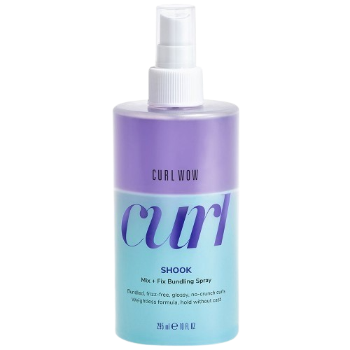 Curl Wow Shook Mix + Fix Bundling Spray is a mix-to-activate spray that combines a “layer” of advanced styling polymers with a “layer” of powerful moisturizing oils (Jojoba, Rice Bran, Passion Flower, Grape Seed + Profaxil-18 Complex) for perfectly defined, weightless, glossy frizz-free curls. Clinically proven to deliver 78% less frizz in high humidity.