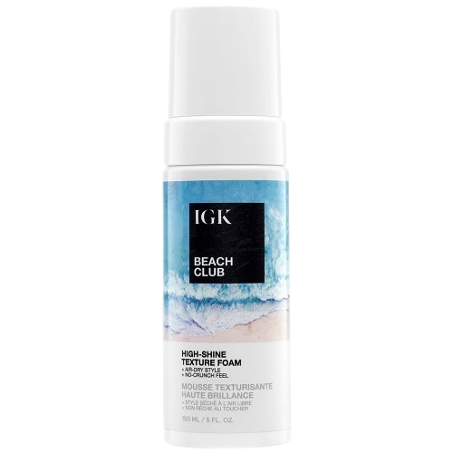 IGK's Beach Club High-Shine Texture Foam provides instant beach waves in a bottle. Air-dry texture foam gives effortless beach waves and high shine without heat styling. Lightweight, hydrating formula provides buildable hold to enhance natural texture without feeling crunchy or looking matte.