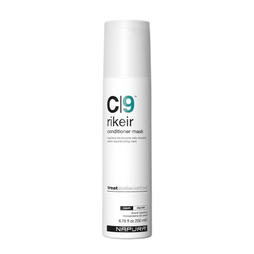 C9 Rikeir Conditioner Mask is a concentrated mask specifically formulated to reconstruct keratin and treat damaged and sensitized hair. Thanks to its rich and exclusive blend of Rice, Wheat, Almond proteins, and Fruit Acids, C9 Rikeir acts directly on damaged areas of the hair, regenerating the hair structure internally.