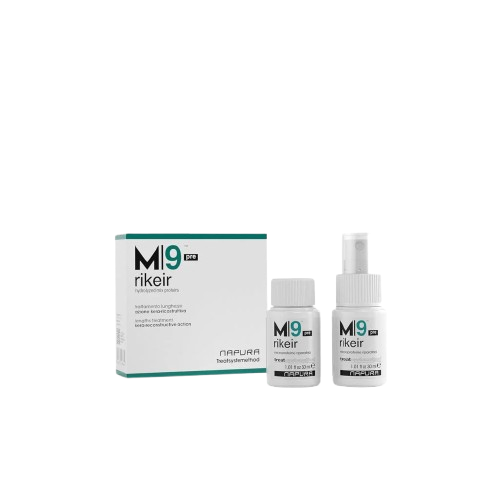 The stem weakens, the hair loses its original shine and resistance by appearing off, dry, fragile and opaque. M9 Rikeir Pre is an innovative protein concentrate specifically designed to reconstruct the damaged features of the keratin structure. The microproteins of the cereals, those of the almond and the fruit acids, in addition to internally repairing the hair, restore its hydration, improving full -bodied and elasticity.
