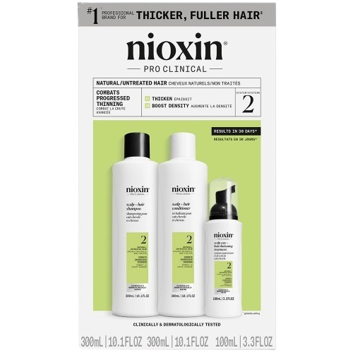 Nioxin Pro Clinical's System Kit 2 is designed for natural, untreated hair with progressed thinning. Clinically and dermatologically tested, this complete scalp & hair thickening system thickens and boosts your hair's density. 8 out 10 users saw thicker, fuller hair in 30 days!